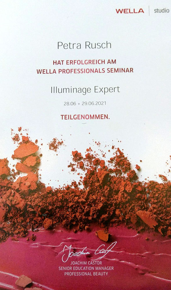 Petra hat erfolgereich am Wella Proffesionals Seminar "Illuminage Experte" teilgenommen.